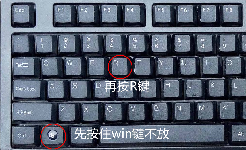 1、先按住键盘Win键不要松手,再安装键盘R键(如下图所示)